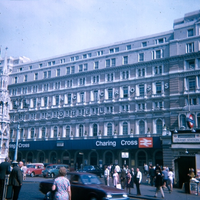 At the time of this picture, the Charing Cross Hotel was run by ''British Transport Hotels'', a subsidiary of the British Railways Board. In the car park can be seen a Morris Minor Van and a Volkswagen Beetle. Notice at this time that the Underground station was known as ''Strand'', a name it retained until 16th June 1973. © David Glasspool Collection