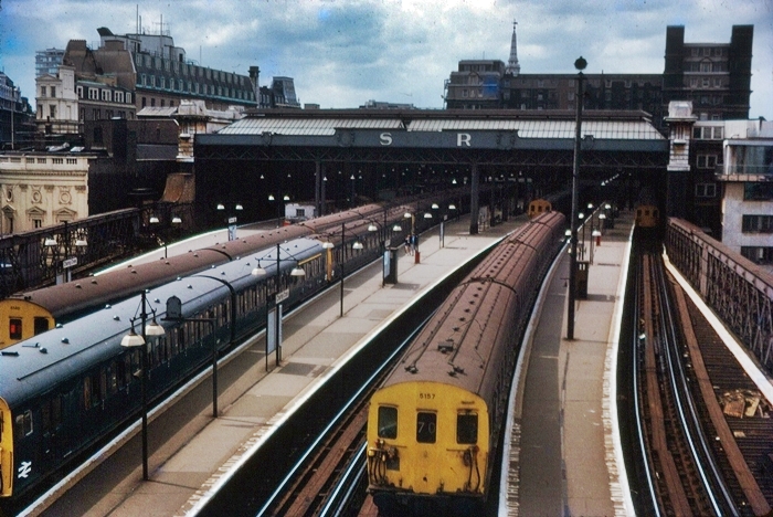 A splendid panorama, viewed from the SR signal box, shows the terminus full of suburban units. In the immediate foreground is Bulleid-designed 4 EPB No. 5157, seen departing with a Dartford service via Bexleyheath. This view shows the full extent of the SE&CR ridge-and-furrow trainshed roof, in addition to the rear of the British Transport Hotel. Hexagonal lampshades are plentiful upon the platforms. Also note the ''SR'' lettering on the trainshed and the shields which flank either side. © David Glasspool Collection