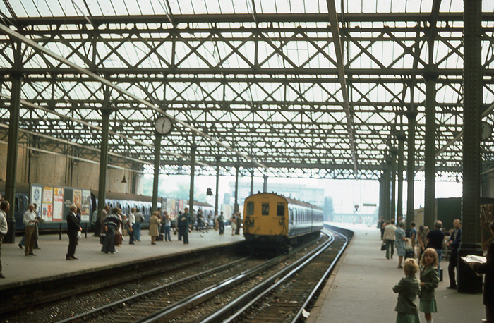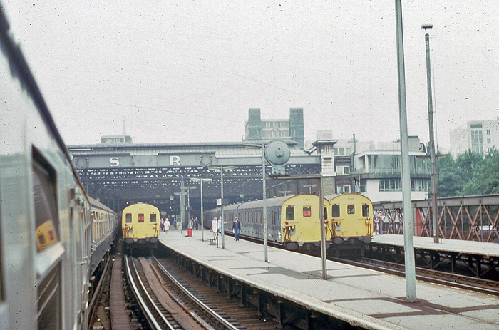An EPB line-up is observed in platform line nos. 2, 3, and 4 under the SE&CR ridge-and-furrow roof. Those portions of the Charing Cross Hotel seen rising up in the background formerly boasted hipped slated roofs and ornate chimneystacks. These were bombed out during World War II and rebuilt in a completely plain style in 1951. © David Glasspool Collection