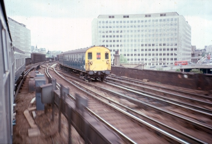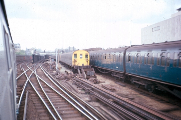 The Charing Cross approaches are again seen from an un-refurbished 4 CEP, this time working the 11:00 service to Dover. A BR-designed 2 EPB, in Rail Blue livery, is seen trailing another train as it heads into the terminus. © David Glasspool Collection