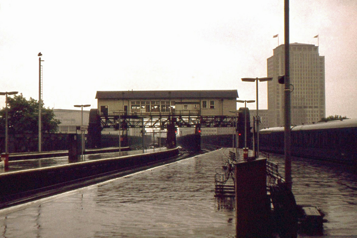 The signal box formerly straddled the tracks at the ends of the platforms and is seen here nearing the end of its operational life. It had come into use on 27th June 1926 with colour light signalling. It closed on 16th April 1976. © Roger Goodrum