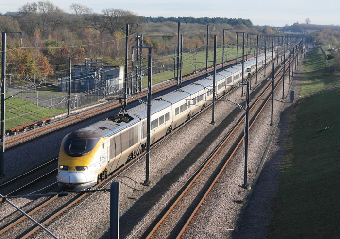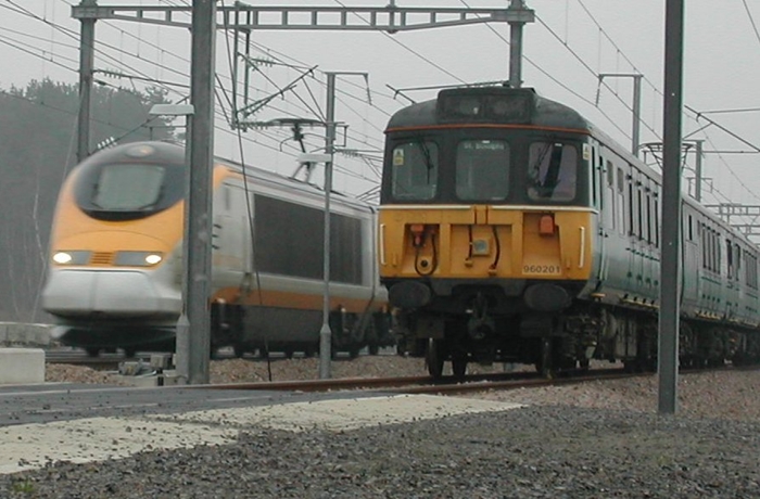 Overtaking in action: a Trans Manche Super Train is seen passing the Hitachi Verification Train at the ''country'' end of Charing Heath loops. The V-Train was a converted Class 310 EMU, used to test Hitachi's ''A-Train'' technology on AC and DC lines, as part of the Class 395 project. © Ian Milligan