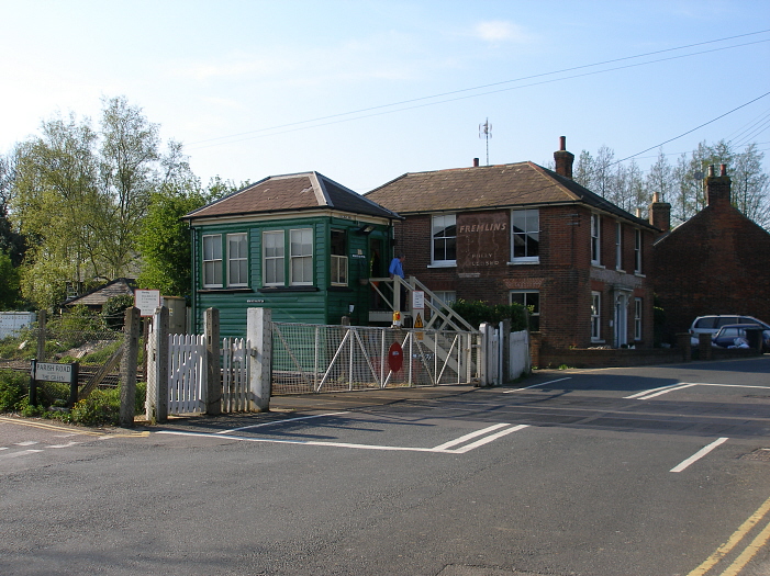 The SER-designed signal cabin remains in existence, although now acts purely as a gate box. The structure has worn this unusual green scheme since 1997. The level crossing gates, although hand-operated, date from 2003. © David Glasspool