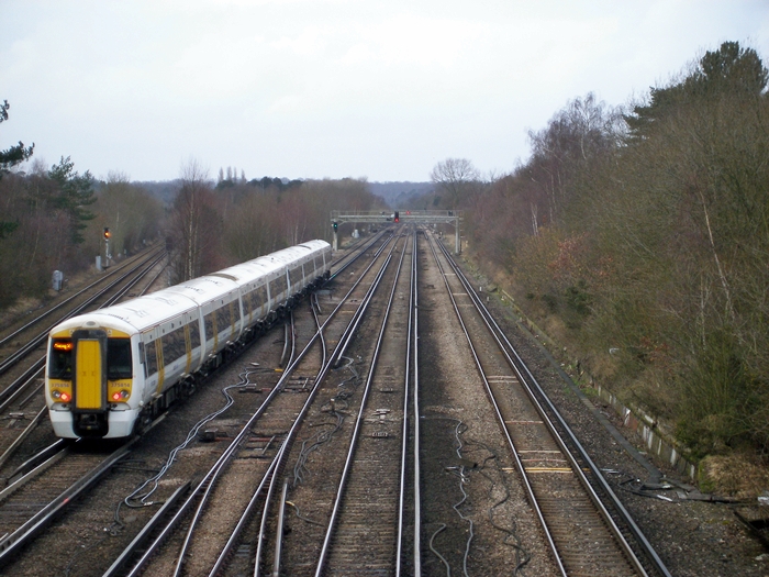 Class 375 No. 375814 trails on the end of a Charing Cross service in this northward view overlooking Petts Wood Junction. Four-track running on this section of line commenced on 6th June 1904. The double-track on left is that of the ''up'' Tonbridge Loop. © David Glasspool