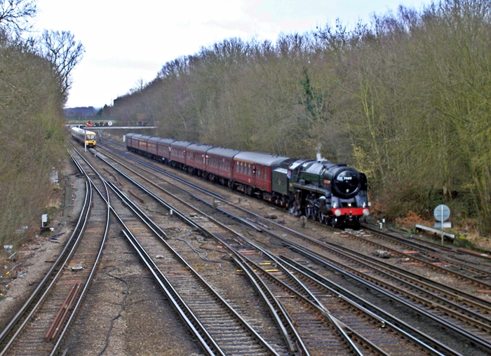A special guest: ''Britannia'' Class Pacific No. 70013 ''Oliver Cromwell'' trundles towards the junction on a series of yellow signals, hauling the ''Sussex Belle''. This was a circuit trip from London Victoria, running via Maidstone East, Ashford, Hastings, Tunbridge Wells, Sevenoaks, and Petts Wood and Bickley Junctions. © David Glasspool