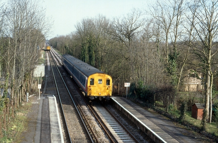 No. 205032 is seen entering Nutfield from the Tonbridge direction. The photograph was taken from the footbridge which had been erected two years previously as part of the Redhill to Tonbridge electrification scheme. Conductor rails were in place, but had yet to be used. © David Glasspool Collection