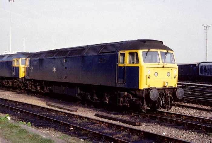 A grubby No. 47201 is, too, pictured at Dover Town Yard, with train ferry wagons on the right and, in the background, the roof line of the Lord Warden Hotel. This locomotive became part of the Railfreight Distribution pool. © Wayne Walsh