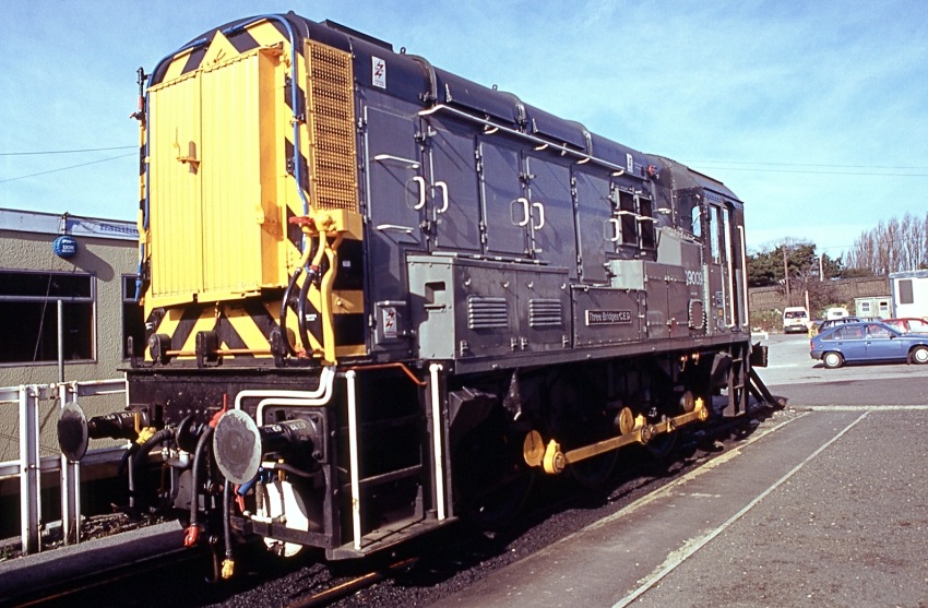 In ex-works condition, cut-down cab No. 08993 is seen outside the locomotive depot at Haworth, West Yorkshire, on the Keighley & Worth Valley Railway (KWVR). Previously numbered 08592 under TOPS, she became No. 08993 in 1985. In the October 2015 edition of The Railway Magazine, No. 08993 was noted as sold to the KWVR. © David Glasspool Collection