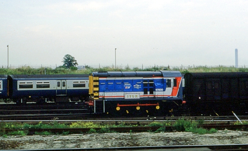 In the colourful "Toothpaste" livery of BR sector Network SouthEast, Class 08 No. 97800 "Ivor" is depicted at Slade Green Depot, in-between the former engine shed (out of view left) and the heavy maintenance building (out of view right). Behind is a Class 455/8 unit from the South Western Division, which had come empty stock from Wimbledon and was not a type deployed on the North Kent Line. "Ivor" had been the shunter at Slade Green Depot since at least 31st December 1976 (ref: The Railway Observer, March 1977) and was transferred to Southern Region departmental stock in January 1979 (ref: RCTS' The Railway Observer, June 1979). Originally No. 08600, "Ivor" was renumbered to 98800 in May 1979, but by 10th of the following month this had been changed to 97800 (ref: RCTS' The Railway Observer, August 1979). 97xxx was the standard numbering series for locomotives in departmental use on BR. No. 97800 was present at the London & Greenwich Railway's 150th Anniversary celebrations at Cannon Street over the weekend of 23rd and 24th of August 1986, by which time it had been repainted from departmental blue and red to Network SouthEast "Toothpaste" colours. In the March 1990 edition of "The Railway Magazine", it was reported that No. 97800 had been renumbered back to its original ID of 08600, having left departmental stock. In November 1991, Motor Luggage Van No. 931095 (formerly No. 9005) became the pilot at Slade Green Depot (ref: The Railway Magazine, January 1992), presumably as a replacement for No. 97800. © David Glasspool Collection