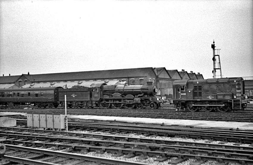 Positioned beyond the south western end of Swindon station is shunter No. D4121. This locomotive had only arrived at Swindon (82C) four months before this photograph was taken, in March 1962. Built at Horwich, it formed part of Swindon Lot No. 453 and came in the company of classmate No. D4122 (ref: RCTS' The Railway Observer, April 1962). As can be seen, wasp stripes were already a feature by then — the RCTS estimates that these started being applied in about 1960. Under TOPS, No. D4121 became No. 08891 and, by 1980, was allocated to Longsight, Manchester. The shunter was still at Longsight in July 1991, along with ten other Class 08s as part of the DCLS RCE Midland Departmental pool (ref: The Railway Magazine, July 1991). In 2004, the locomotive gained Freightliner green livery (ref: The Railway Magazine, December 2004) and, in 2006, the name "J. R. 1951-2005" was applied (ref: The Railway Magazine, August 2006) — by that time, No. 08892 was at Southampton Maritime. An overhaul on the shunter was completed in late 2022, during which it was painted into bright orange Freightliner livery, and it returned to work at the Port of Felixstowe. Also seen in the above view, approaching from the south west, is "Castle" Class No. 7003 "Elmley Castle". In the year of this picture, the Western Region well and truly waged war on steam, with the sudden withdrawal of the "King" Class, the then new diesel-hydraulics arriving in force. No. 7003 survived in service until 1964, being withdrawn from 85B in August of that year (ref: RCTS' The Railway Observer, November 1964). © David Glasspool Collection