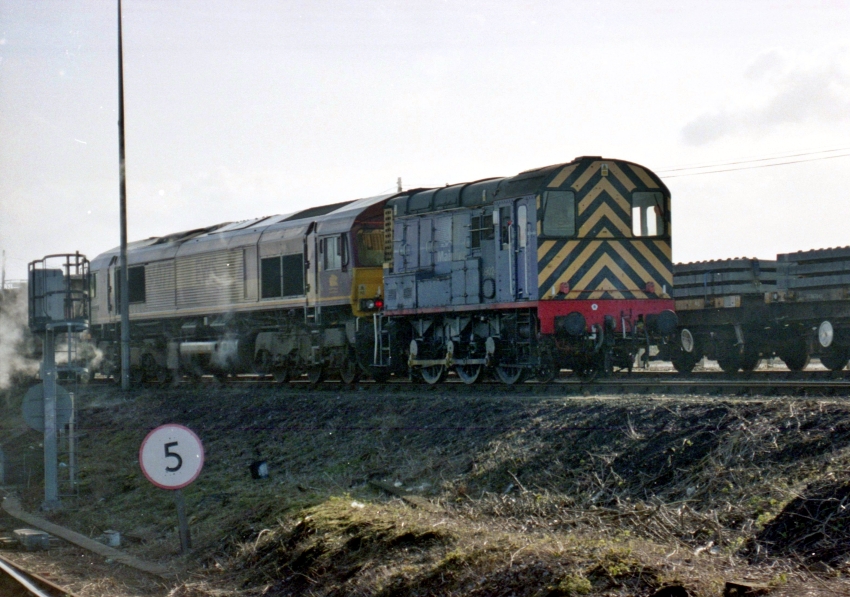 Accompanying No. 09006 at Hoo Junction was "Mainline" liveried No. 09024, seen here coupled to Class 66 No. 66077. A key factor behind the demise of diesel shunters at freight yards has been the use of "main line" locomotives such as Class 66s to marshal wagons. In the month after this photograph was taken, No. 09024 was moved to Eastleigh to work the yard there whilst the usual shunter, No. 08765, was under repair (ref: The Railway Magazine, June 2006). No. 09024 itself failed at Eastleigh later in the same year with a faulty generator, requiring another shunter, No. 08482, to be delivered there in the September as a replacement (ref: The Railway Magazine, November 2006). In October 2011, the locomotive arrived at C.F. Booth, Rotherham, for scrapping (ref: The Railway Magazine, January 2012), but within a few months was purchased for preservation and moved into storage in Wishaw, Sutton Coldfield, West Midlands (ref: The Railway Magazine, March 2012). In early 2014, No. 09024 arrived at the East Lancashire Railway. © David Glasspool