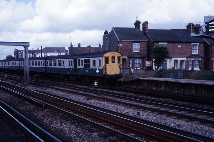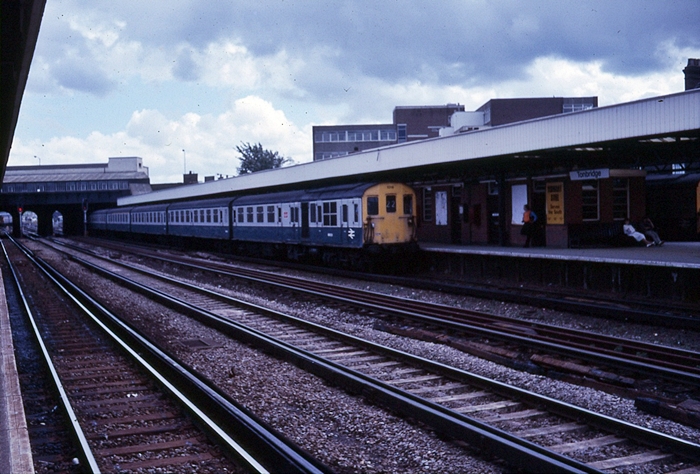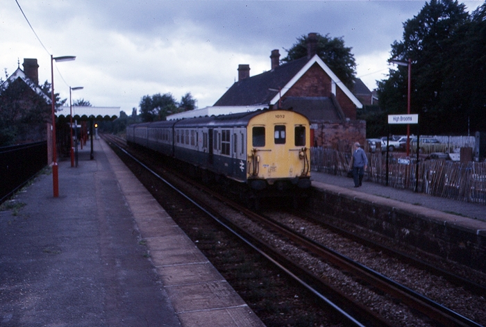 Five-vehicle No. 1032 is seen at High Brooms (formerly Southborough), 1½-miles north of Tunbridge Wells Central, London-bound. Rusty conductor rails show that electrification of the route was imminent. © David Glasspool Collection