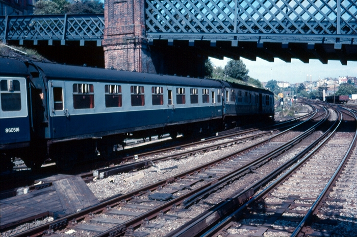 No. 1006 managed to derail itself at the eastern end of Hastings station. The power car can be seen dislodged from the rails, underneath the lattice bridge. Sidings at Tonbridge, Hastings, and Grove Park were used to stable the DEMU stock overnight. © David Glasspool Collection