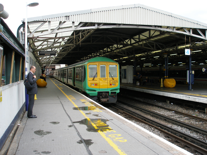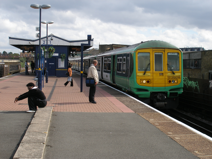 On Tuesday 23rd August 2001, it was announced that the ''GoVIA'' group was to take over the South Central franchise operation from Connex. This officially occurred at 02:00 on the morning of Sunday 28th of the same month. "GoVia South Central" was re-branded "Southern Railway" from 27th May 2004, and rolling stock began appearing in an attractive green and white scheme. Class 319 stock in the "Southern Railway" pool started receiving the then new livery in December 2005. In the above picture, No. 319008 is depicted at Loughborough Junction with a service to Luton. © David Glasspool