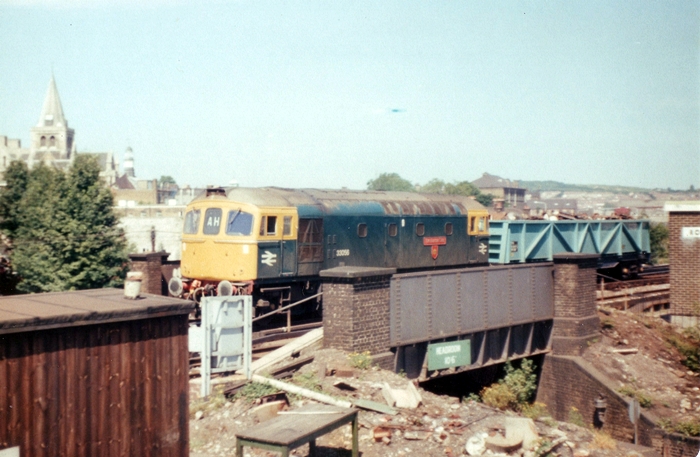On Monday 22nd June 1981, No. 33056 ''The Burma Star'' is seen approaching Rochester at 11:12, with Sheerness Steel scrap wagon No. PR3000. This is possibly a Willesden to Sheerness working. Of note is the Southern Region green-painted HEADROOM 10'6'' sign on the railway bridge, which crosses the entrance road to the goods yard. Towering in the background can also be seen the spire of Rochester Cathedral. © Chris