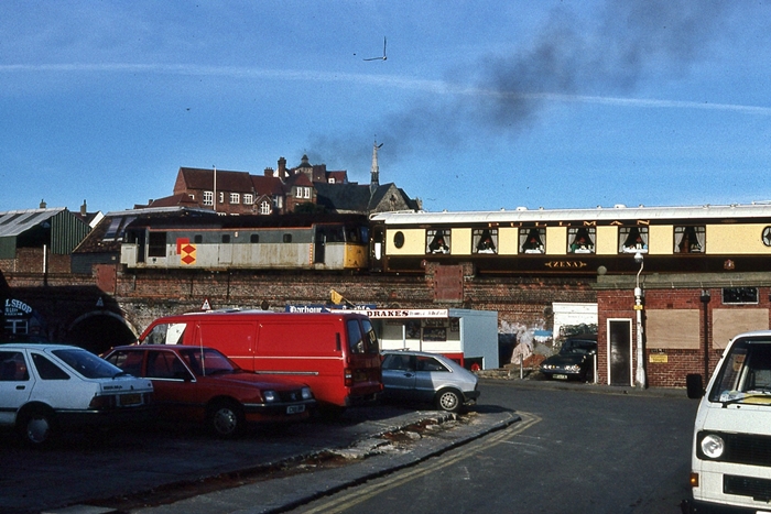 A luxurious service but a grubby locomotive. No. 33206 is seen hauling the ''British Pullman'' section of the VSOE up the incline from Folkestone Harbour. The diesel is wearing ''Speedlink Distribution'' livery and at that time was a regular performer at Dover, where it undertook synchronised wagon shunting on the train ferry with sister locomotive No. 33205. © David Glasspool Collection