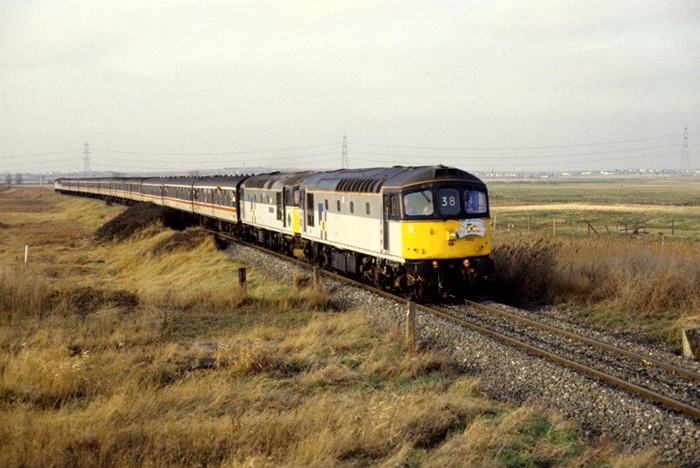 Seen on the Hoo Peninsula, upon the single-track branch line to Grain, is the ''Crompton Constructor'' rail tour. This ran from Wolverhampton to Dover Western Docks, taking in the Grain and Sheerness-on-Sea branches en route. Leading is Class 33 No. 33063, followed by No. 33050 and a rake of InterCity-liveried BR Mk 1 carriages. On the end of the rake for this portion of the tour was Class 56 No. 56055, to take the tour back to Hoo Junction. At this time, both Class 33 diesels were wearing the scheme of the TrainLoad Construction business sector. © Wayne Walsh