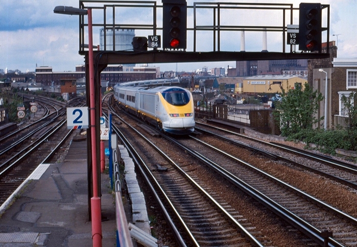 Another shiny Class 373, led by No. 3015, is seen passing the now well known location of Wandsworth Road. This is long before the completion of the CTRL, thus the set will remain on existing domestic lines right up to the Chunnel portal. © David Glasspool Collection