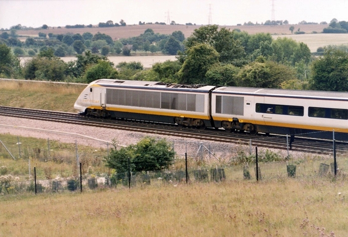 This next view of the trailing power car of another continent-bound service at Fawkham Junction clearly shows the separate bogies in place of articulated couplings. The pantograph closest to the first carriage is used through the tunnel; the other is for Belgium. © David Glasspool