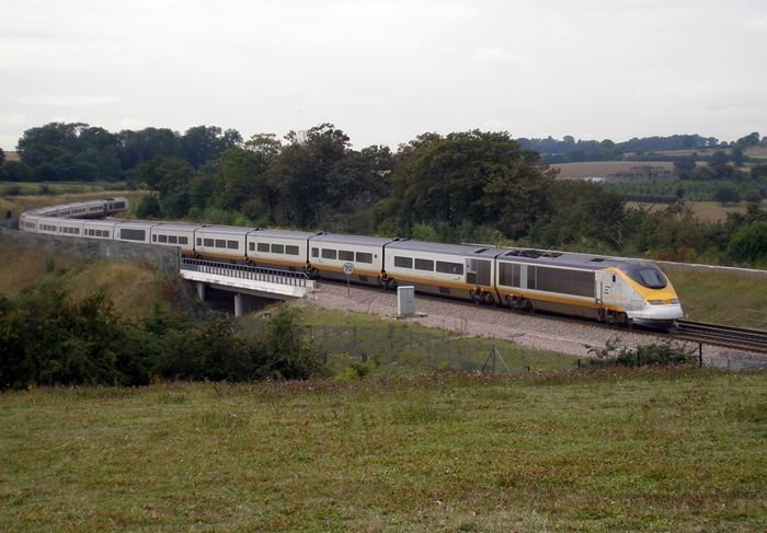 The 11:13 Paris Gare du Nord to Waterloo International service was seen rounding the curve on the approach to Fawkham Junction, on time. © David Glasspool