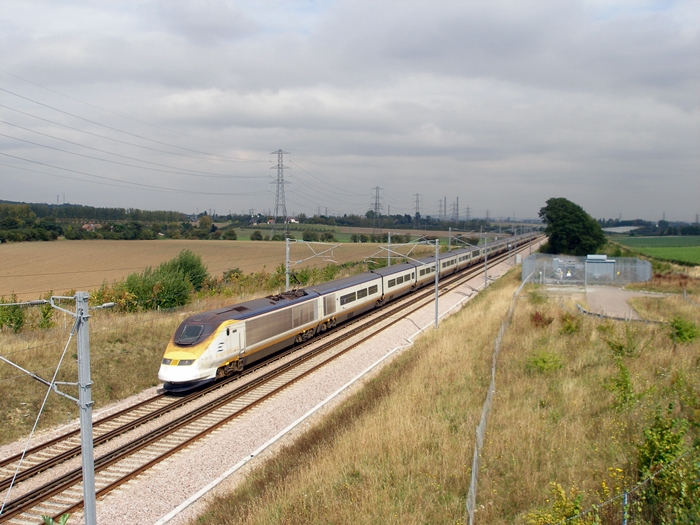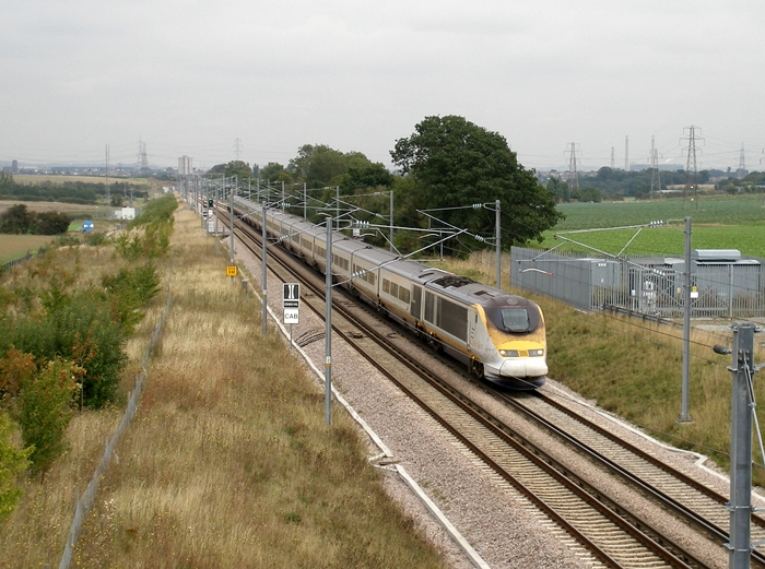In view on 5th September 2007 is the 12:40 Waterloo International to Brussels service. The formation is too seen on the 3½-mile long spur which connects the ''Chatham'' main line with the CTRL's ''Section 1''. At the time, it had been planned for Brussels trains not to serve Ashford International after the opening of ''Section 2'' of the CTRL. On the right is one of the spur's electricity sub-stations. © David Glasspool