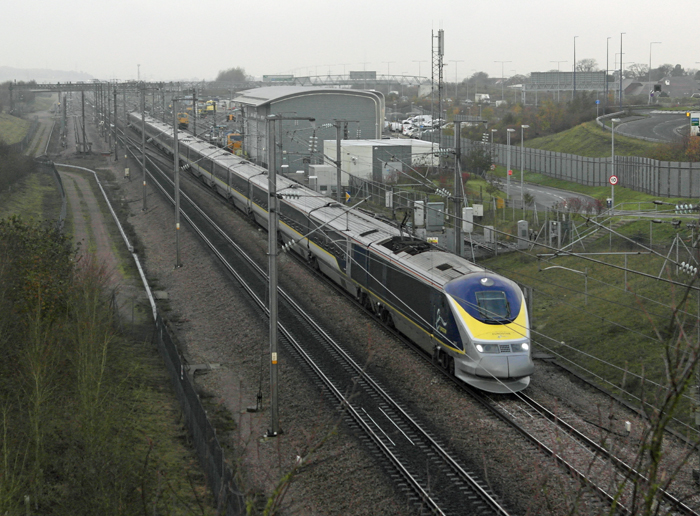 Refurbished half set Nos. 3015/3016 are seen passing Singlewell Infrastructure Maintenance Depot with the 10:24 St Pancras International to Paris Gare du Nord. © David Glasspool