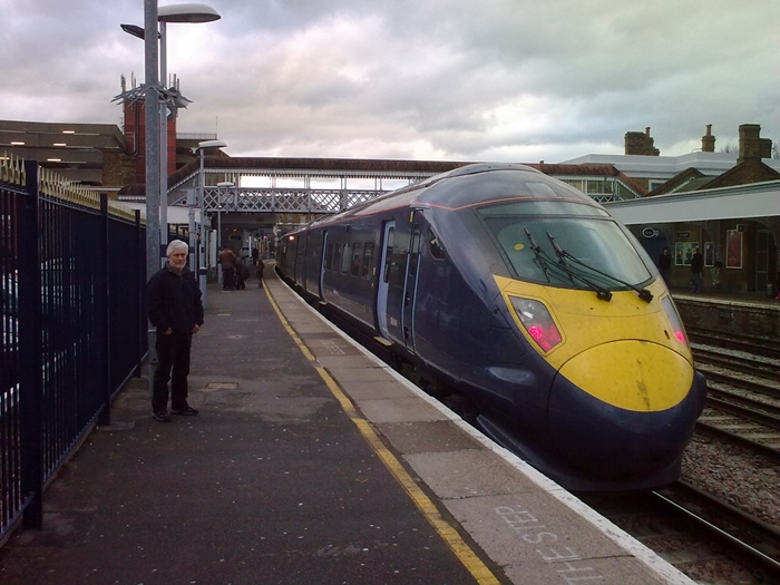 A ''Javelin'' on third rail: No. 395018 is seen rounding the curve at Margate at 18:35, on a test run. In front of the unit can be seen iron girders between the rails, which indicate the position of the subway. © John Horton