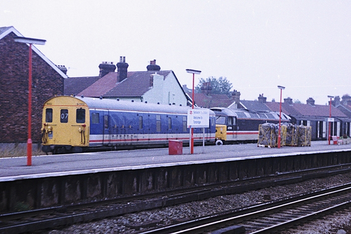 A seemingly unusual pairing witnessed in the bay platform at Tonbridge, this combination was in fact a daily occurrence during 1989. NSE-liveried MLV No. 419002 sits in the company of an InterCity Class 47. Behind the Class 47 is a rake of BR General Utility Vans (GUV), whilst on the platform are cages loaded with parcel bags. © Treflyn-Lloyd Roberts