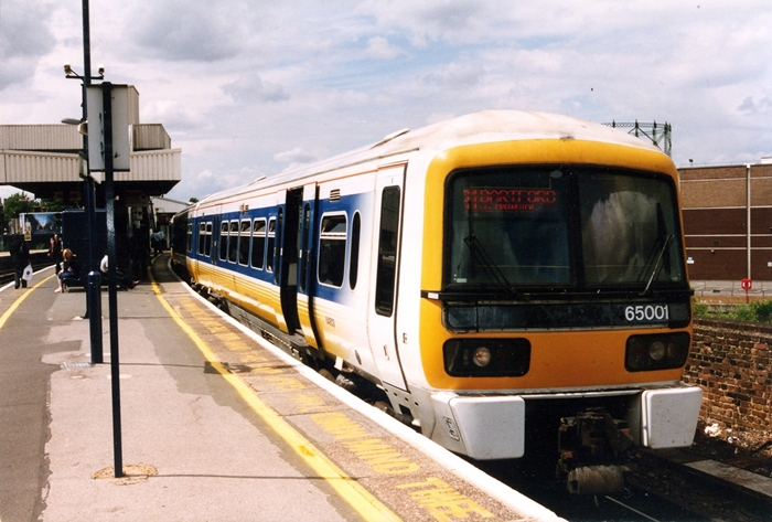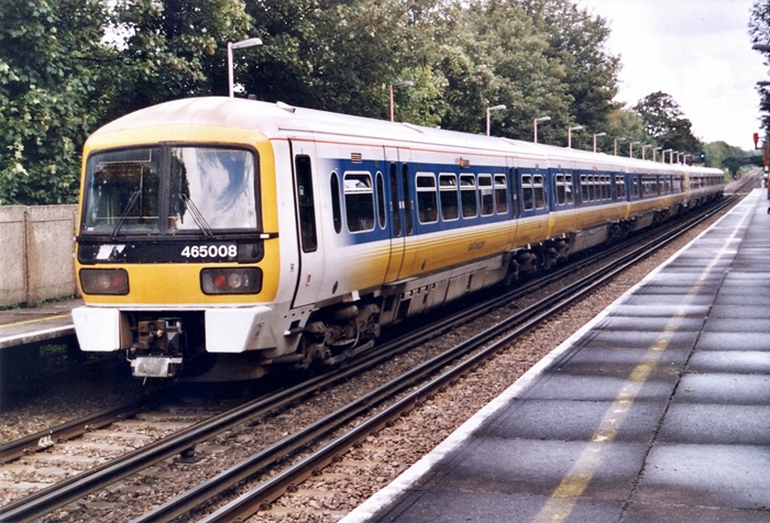 First of the class, No. 465001, is seen at Dartford's platform 4, after terminating with a service via the Bexleyheath line. It is wearing the first ''Connex'' livery which appeared on Class 365 units and a handful of Class 465 units in 1996/1997. © David Glasspool