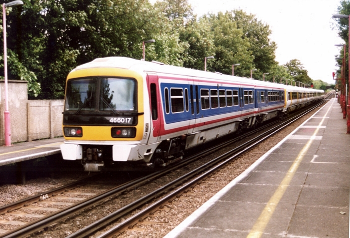 Now for a Class 466. No. 466017 is seen trailing on the rear of the ''54'' service from Charing Cross to Gravesend, at Stone Crossing. The NSE ''flashes'' have disappeared from the cab front, but the otherwise the livery remains original. The two Class 465 units ahead are wearing Connex's second generation white/yellow/black livery. © David Glasspool