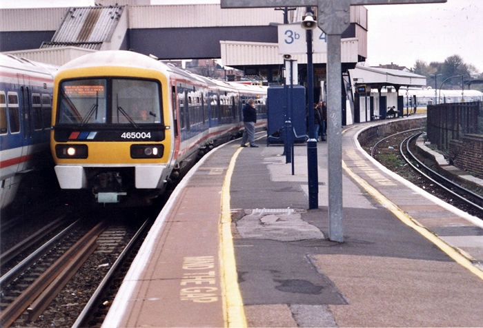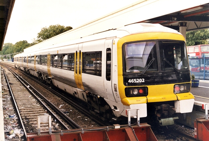 A sparkling No. 465202, recently re-painted (or perhaps plastered with vinyl) is seen in one of the bay platforms at Orpington. The livery was inspired by the new scheme launched on the Class 375 ''Electrostar'' units from 1999 onwards. The first ''Networkers'' received the colours in 2002. © David Glasspool