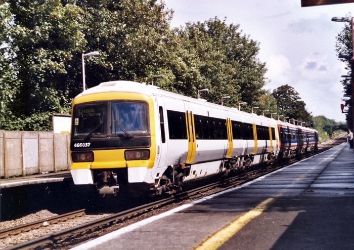 By the time of this view, Class 465 and 466 units had started to receive sloped buffer covers. No. 466037 is seen passing through Stone Crossing non-stop, trailing on the rear of a Charing Cross to Higham service. This was the year of the Higham/Strood Tunnel closure, thus North Kent Line services went no further than Higham. © David Glasspool