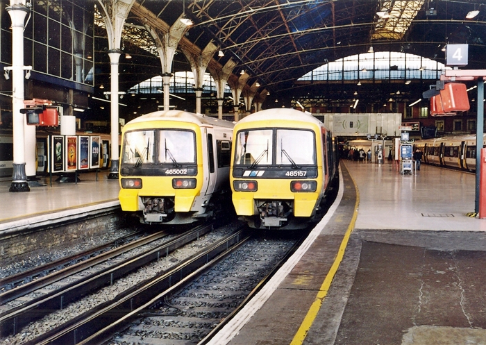 Nos. 465002 and 465157 are seen underneath the cavernous trainshed of London Victoria. No. 465157 had recently arrived with a service from the Catford Loop. © David Glasspool