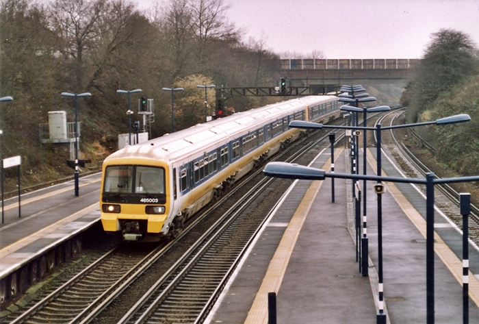 No. 465003 is seen entering Swanley station, pairing with another unit of the class on a service from Blackfriars, destined for the Otford line. © David Glasspool