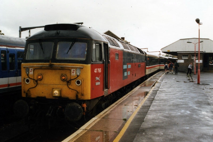 Above, Rail Express Systems-liveried Class 47 No. 47765 is depicted at Ramsgate after bringing in the summer Saturdays-only cross-country service from Birmingham, on 24th August 1996. In tow are BR Mk air-conditioned carriages in InterCity ''Swallow'' livery. © Andre Kent