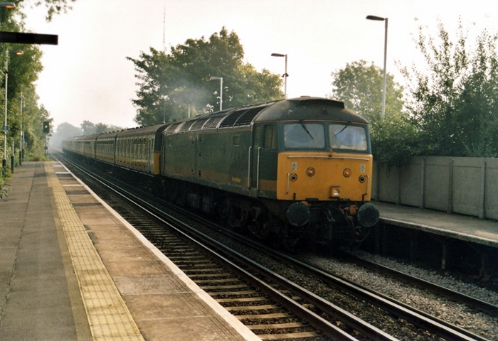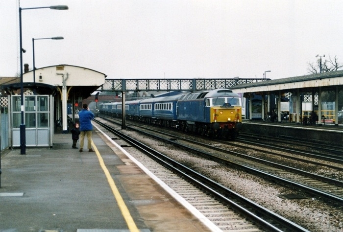 No. 47712 ''Artemis'' was seen hurtling through Paddock Wood, top and tailing with No. 47709 ''Dionysos'' on the London Victoria to Folkestone Harbour and Dungeness ''Blue Pullman''. The first test run of this whole new refurbished formation took place on 5th January 2006, and this was followed on 12th of the same month by the first public service. The whole train was First Class only. © David Glasspool