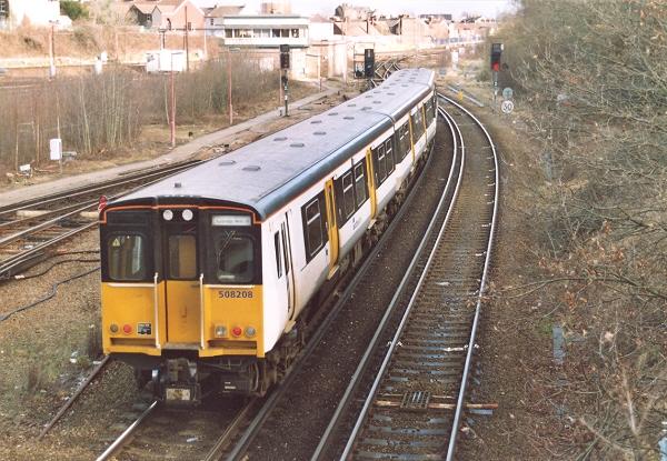 No. 508208 is seen on an earlier date, this time on 16th February 2006 trundling towards Tonbridge