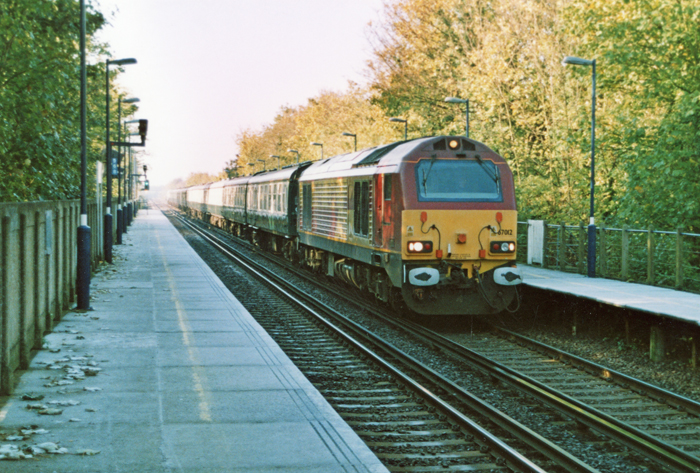 Following on from the previous photograph, the penultimate member of the fleet, No. 67029, is seen on the trailing end of the Victoria to Victoria via Grain charter at Stone Crossing. Travelling via Denmark Hill, Lewisham, Sidcup, and Dartford on the outward leg, the train returned to the terminus via the Medway Valley Line, Tonbridge, Sevenoaks, Otford, Swanley, St Mary Cray Junction, Hither Green, Lewisham, and Denmark Hill. No. 67029 is wearing an all-over silver scheme, which was applied when the locomotive became dedicated to EWS' then new "Executive Train", which was commissioned to traffic in October 2004. © David Glasspool