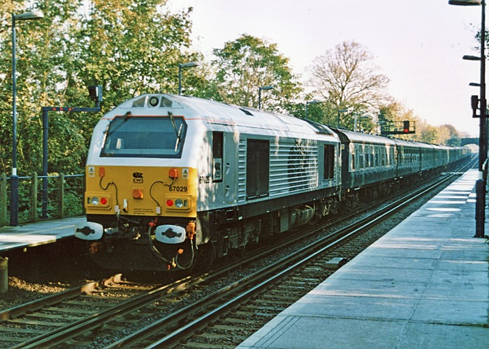 Since the end of EWS' contract with Royal Mail, the use of the Class 67 has been varied and for what is a comparatively small fleet of locomotives, an assortment of liveries have already been worn. In October 2004, EWS formed an "Executive Train", which comprised three dark maroon-painted BR Mk 3 carriages (standard passenger trailer, ex-Buffet car, and ex-sleeping car) and a silver Driving Van Trailer (DVT) in the 82xxx series. The DVT and coaching stock had been displaced from the West Coast Main Line as a result of the introduction of the "Pendolino" sets in 2002, and the "Executive Train" was intended to carry EWS' Senior Management and clients. The train was based at Toton, Nottinghamshire, and Class 67 No. 67029 was allocated to haul the formation, being repainted into an all-over silver scheme matching the aforementioned DVT.