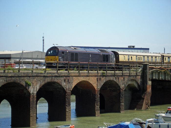 Trailing on the rear of the "down" VSOE at Folkestone Harbour was "Royal Plum" liveried No. 67005 "Queen's Messenger", which became a regular fixture on this glamorous working when not on stately duties. © David Glasspool