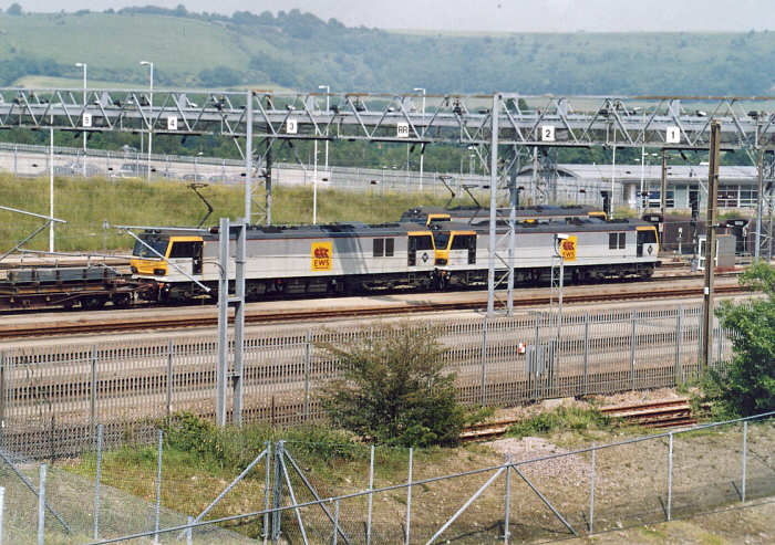 Rather than going to the expense of repainting every locomotive, and as a quick fix, several members of the EWS fleet received body-side vinyls with their owner's logo. Three Class 92s are in evidence at Dollands Moor, wearing this livery variation. On the left is No. 92011 "Handel", whilst on the right is No. 92037 "Sullivan". © David Glasspool