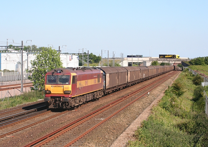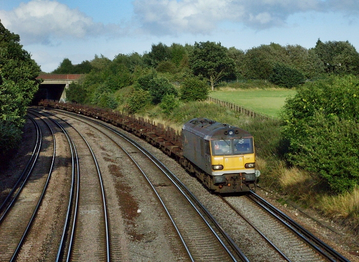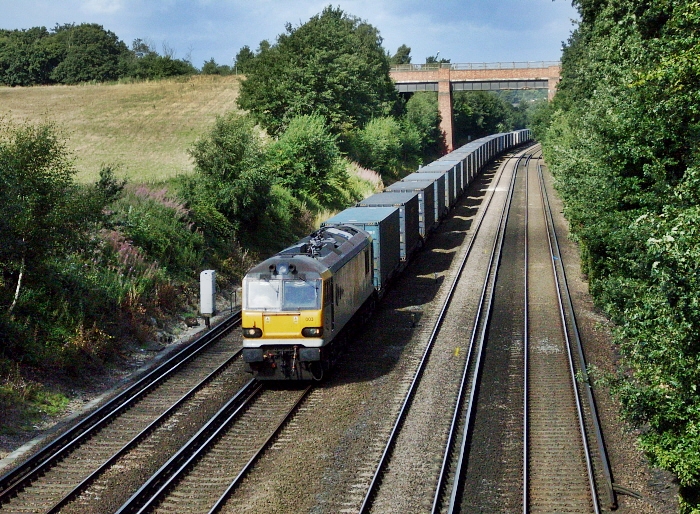 First of the Class, No. 92001, is seen in glorious weather at Sevington, on the south eastern outskirts of Ashford, with the 6D40 1634 Dollands Moor to Wembley. This locomotive has since been repainted into all-over "Deutsche Bahn" bright red - minus yellow warning panels - and is currently working in Bulgaria. © Edward Clarkson