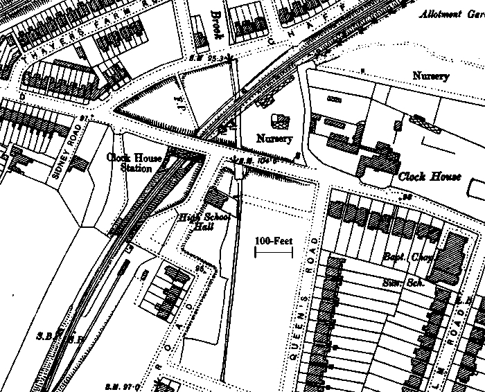 Ordnance Survey of Clock House dated 1894. At this time, the goods yard comprised just one siding, and a trailing crossover existed between the running lines, south of the platforms. The shaded areas indicate the extent of the platform canopies and station buildings. The station's namesake is marked on the right-hand side of the map and was soon to be demolished.