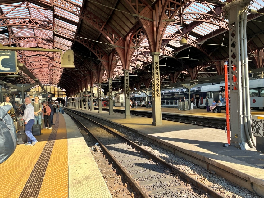 The departure to Hamburg was scheduled for 10:22 from Copenhagen Central's platform 5. This is a north westward view from that platform underneath the cavernous train shed, which covers twelve tracks and an equal number of platform faces, the latter formed into six islands. A thirteenth platform face exists south east of the trainshed, on the opposite side of the road bridge that is just visible in the next photograph. In the September 1898 edition of "The Railway Magazine", it was remarked: "Copenhagen, unfortunately, has not a station worthy of the capital". Subsequently, in 1903, work began on constructing a new main station for the city, which was designed by Professor H. Wenck, Chief Architect for new construction to Danish State Railways (ref: Locomotive, Railway Carriage and Wagon Review, 15th October 1924). Opened in 1911, the level of the rails at the station was made 6.25-metres below street level; above the tracks and perpendicular to them, a main hall of 138-metre length by 56-metre width was created, which was covered by a twin-span roof of timber construction supported upon stone columns (ref: Locomotive, Railway Carriage and Wagon Review, 15th October 1924). © David Glasspool