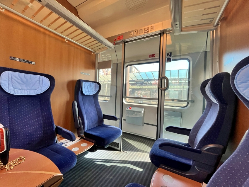 Most of the Second Class accommodation comprises open seating in a 2+2 formation: a mixture of "airline" style and four seats facing each other around a table. The carriage immediately behind the locomotive contained a couple of Second Class compartments of six seats each, the pair nearest the window sharing a table. Departure from Copenhagen was just one minute behind schedule, at 10:23. © David Glasspool