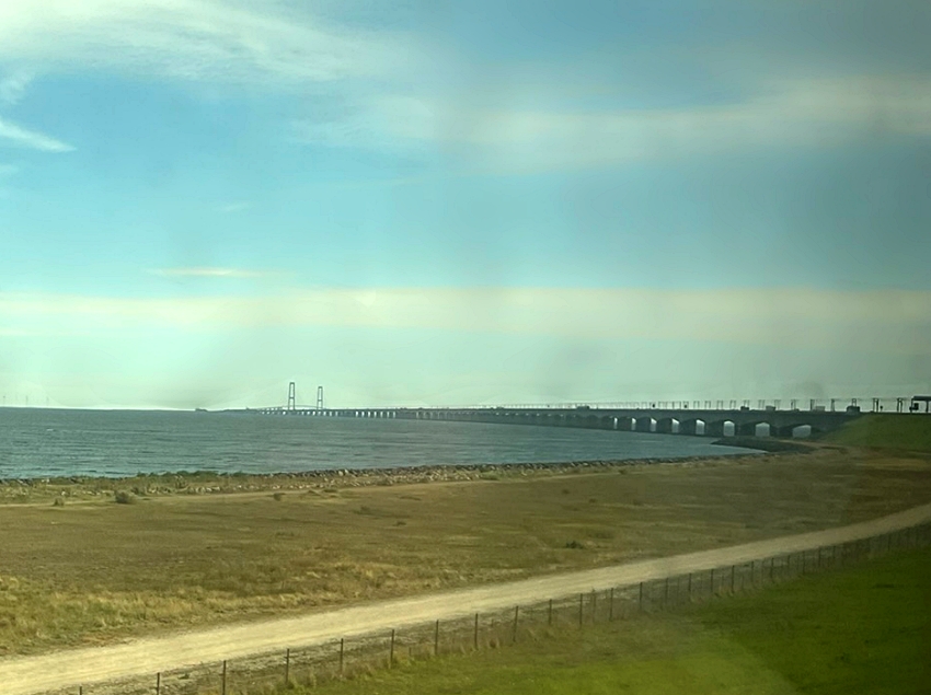 After Ringsted is a 96-KM run to Odense, the latter situated on the island of Fyn. The islands of Zealand (upon which is Copenhagen) and Fyn are separated by a body of water called the "Great Belt", and in 1988 work began on an enormous project to connect the two by road and railway. Today, this is known as the "Storebælt (Great Belt) Crossing", which comprises the 8,024 metre-long "East Tunnel" for railway traffic, the 6,790 metre-long "East Bridge" for road traffic, and the 6,611-metre-long West Bridge for both cars and trains. The tunnel and East and West Bridges all meet on the uninhabited island of Sprogø, in the middle of the crossing, which grew four times its original size as part of the construction works. The crossing officially opened to railway traffic on 1st June 1997 and to road vehicles on 14th June of the following year, the project having cost DKK 21.4 billion at 1988 prices (ref: Storebaelt Facts and History, storebaelt.dk). In the above photograph looking in the Copenhagen direction from Fyn, just after the train had completed the crossing, the pylons and cables of East Bridge can be seen in the distance. In the foreground is the low-level West Bridge, which carries road and railway side-by-side. © David Glasspool