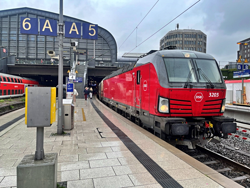 The Hamburg service starts at Copenhagen. This view, looking in the opposite direction to the previous one, shows the carriages for Hamburg arriving from the sidings located south west of the station, being reversed into platform 5 by Siemens "Vectron" No. EB 3203. On 14th September 2020, the first three (of which No. 3203 was one) of forty-two "Vectron" electric locomotives ordered by Danish State Railways (DSB) arrived in Denmark, and on 26th of the following month the type entered regular passenger service (ref: DSB Interim Report, Third Quarter 2020). Since 17th June 2023, DSB has used "Vectron" locomotives on the Copenhagen to Hamburg route with a fleet of fifty-six IC1 carriages — one captured here — the latter of which are leased from Deutsche-Bahn (DB) (ref: DSB Annual Report, 2023). The advent of this stock combination released the incumbent IC3 units from the service, the latter being deployed on other lines such as that between Aarhus and Hamburg (ref: DSB Annual Report, 2023). © David Glasspool