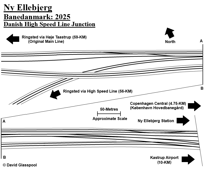 The first stop from Copenhagen is Ringsted, thirty minutes into the journey. Between Copenhagen and Ringsted, the Hamburg service uses the 60-KM double-track electrified high-speed line that officially opened on Friday, 31st May 2019, upon which the train travels at speeds of up to 200 KPH (ref: Copenhagen to Ringsted, Projects, Banedanmark, 2019). The station at Ringsted is situated upon the original main line that links Copenhagen with the rest of Denmark, via Høje Taastrup, and this view is looking back in the direction of the capital. © David Glasspool