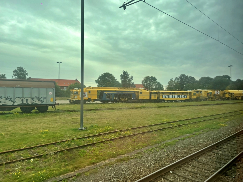 The ends of the platforms at Padborg, the train's final stop in Denmark, are positioned little over half a kilometre from the German border. The site is equipped with an extensive array of sidings, unsurprising given it is a border station — there even still exists a turntable here. By the time Padborg was reached, there were passengers camped out on the floor in the vestibule, so it was not possible to get a picture out of the carriage door looking back towards the station. Seen here are the southern ends of the sidings that exist on the eastern side of the station. In view is a Plasser & Theurer 09-32/4S tamper, belonging to construction firm "Swietelsky". Tamper machines are used to correct track alignment errors and consolidate ballast to provide stable support. After measuring the position of the rails, a tamper can lift the track — complete with sleepers attached — using a series of hydraulic cylinders to remove kinks and smooth out dips. © David Glasspool