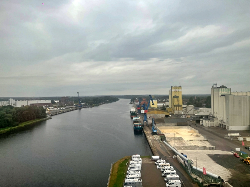 Rendsburg High Bridge carries trains 138-feet (42-metres) above water level (ref: The Railway Magazine, September and October 1949). This is a roughly westward view which includes, on the right bank of the canal, the buildings of agricultural group "Ceravis AG" and logistics firm "HaGe". © David Glasspool